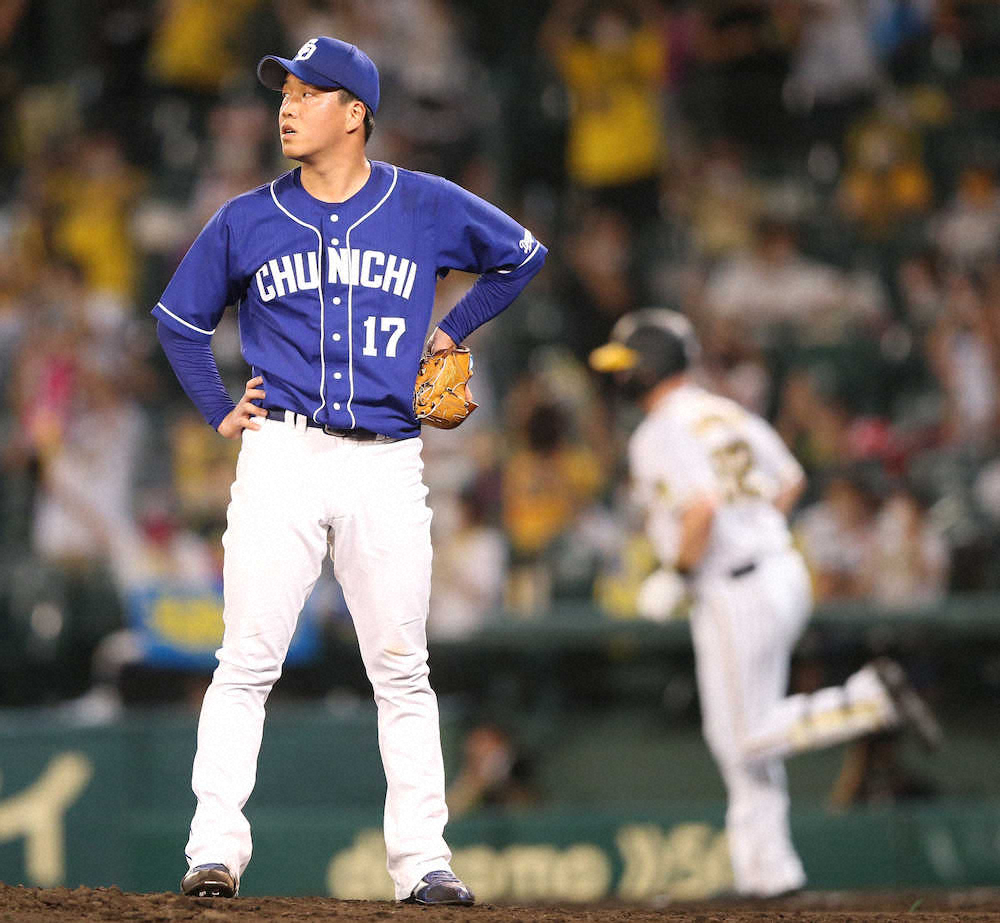 <神・中(12)>6回1死、サンズ(奥)に2打席連続本塁打を浴びて呆然の柳(撮影・北條 貴史)