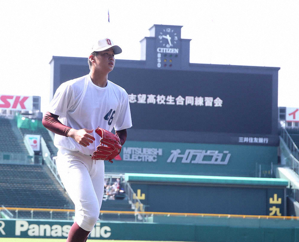 5人目の打者は練習会をサポートした同大・杉森圭輔捕手。148キロを二塁打された山下は「(大学生が)出てきてびっくりした。まだまだだなと思った」と反省も忘れず。進路はプロ一本。「甲子園は初めてで凄く感動した。とても良い経験。いろいろ吸収して、上のレベルで勝負していける投手になりたい」。特別な舞台で、改めての高評価と、得難い経験を手にした。 (松井 いつき)