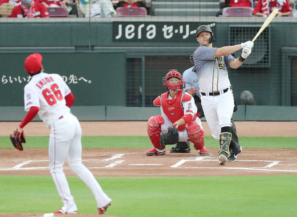 近本が内野安打、糸井は四球で1死一、二塁。4番として期待がかかる場面で打席に立つと、フルカウントから外角高めにきた遠藤の143キロ直球を豪快に振り抜いた。高々と舞い上がった打球は左中間スタンドに着弾した。「真っすぐを仕留めることができて、先制点を取ることができて良かったね」。開始早々の一撃で敵地マツダの鯉党を黙らせ、ベンチ前ではお決まりの“ハッピーハンズ”。これで得点圏では41打数20安打、打率・488と再び5割の大台を目前とした。