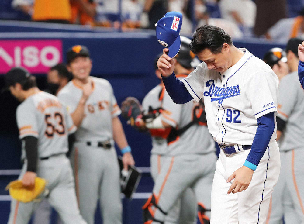 <中・巨(17)>巨人に連敗し、ガックリと頭を下げる与田監督(撮影・椎名 航)