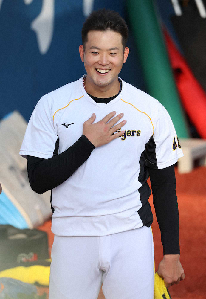 <D・神>笑顔を見せる阪神・斎藤(撮影・小海途 良幹)