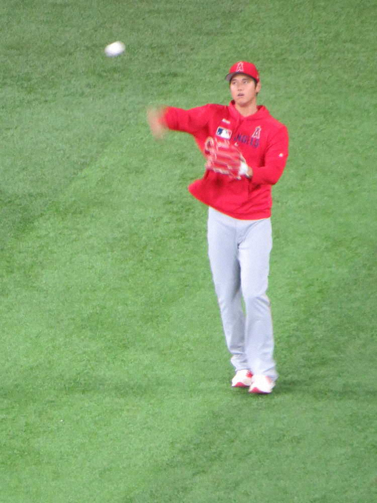 また、大谷は試合前に「右肘付近の屈筋回内筋痛」と診断されて以降、初めて守備練習で上からスローイングを行った。