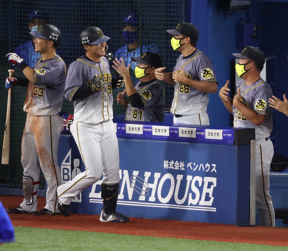 <D・神15>4回1死一、二塁、右越え3ランの代打・陽川(左から2人目)を出迎える矢野監督(右から2人目)=撮影・小海途 良幹