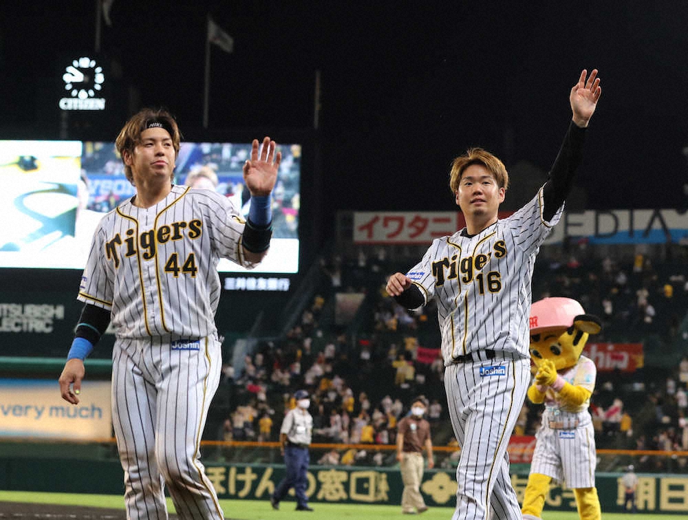 <神・広>ファンに手を振る西勇輝(右)と梅野(撮影・大森 寛明)
