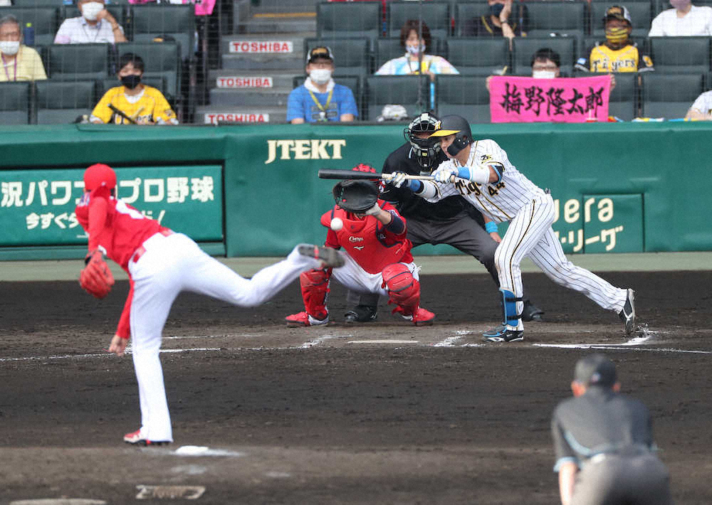 初回無死一塁の第一打席に1球で犠打を決めると、おなじく無死一塁の5回にも1球で犠打を成功。さらに7回。またも無死一塁で打席にはいり、またも1球で犠打を決めた。一塁走者はいずれも1番・近本だった。