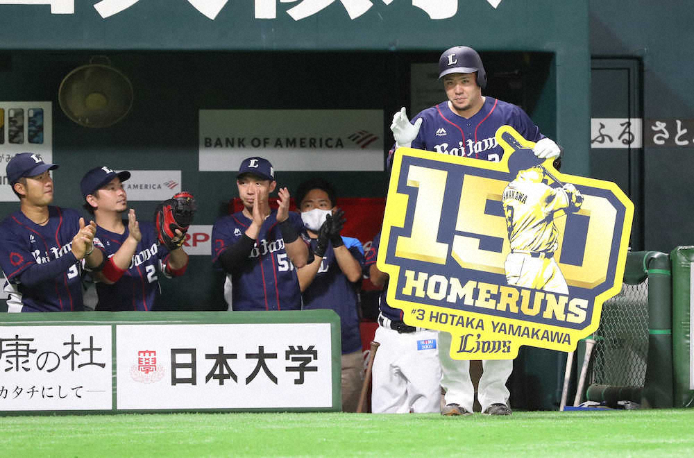 西武山川穂高内野手が、2―7の6回無死で、ソフトバンク先発・武田が1ボール1ストライクから投じた118キロのカーブを、今季21号となる左越えソロ。これで通算150本塁打を達成した。