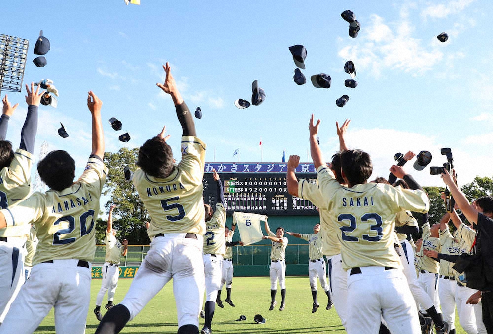 <NTT西日本・大阪ガス>都市対抗本戦出場を決め帽子を投げ歓喜するNTT西日本ナイン(撮影・後藤 正志)