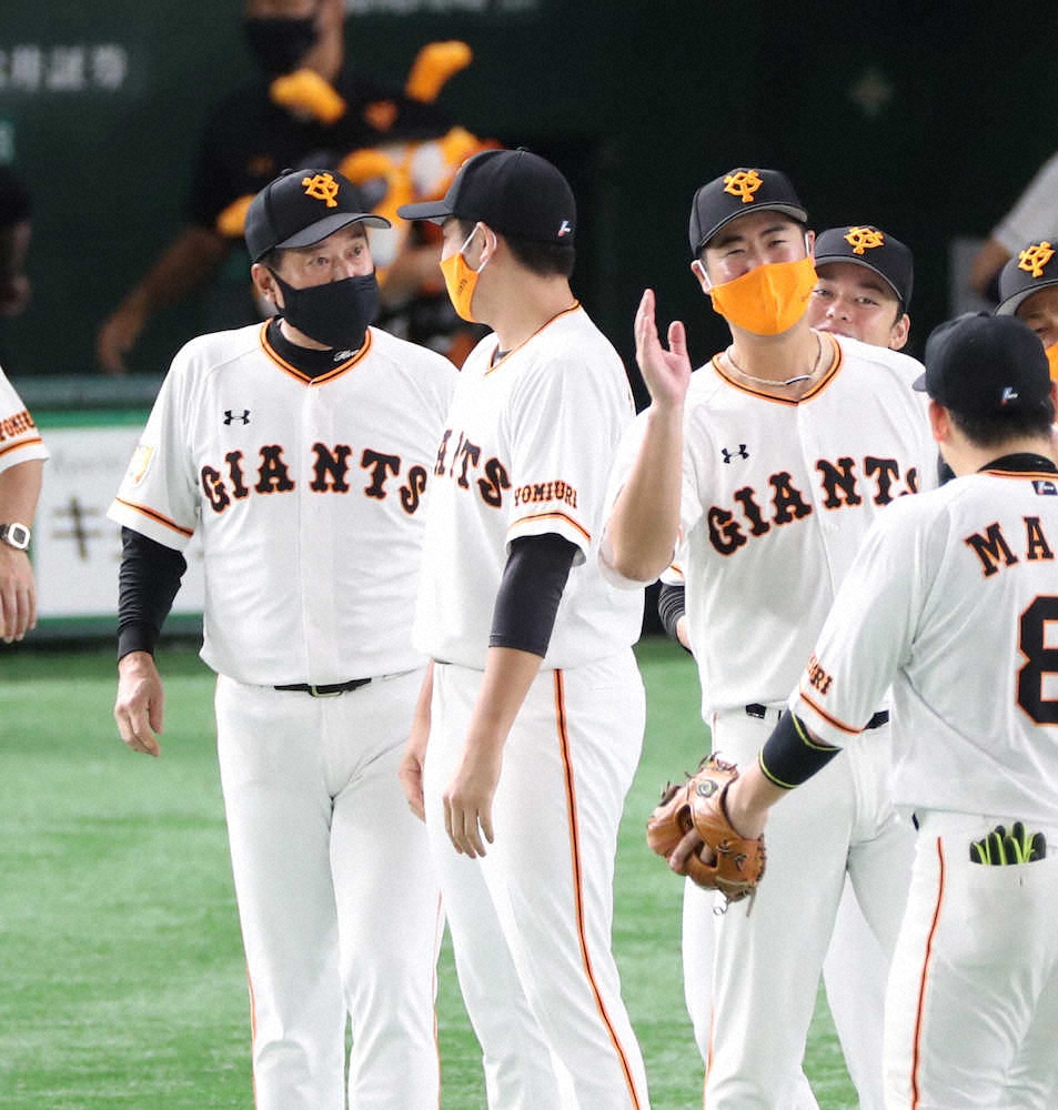<巨・神>試合後、菅野(左から2人目)に声をかける原監督(左)(撮影・坂田 高浩)