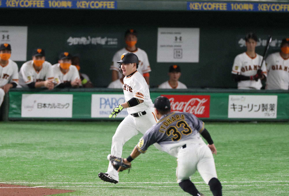 <巨・神>3回2死一塁、丸は二塁内野安打を放つ(撮影・坂田 高浩)