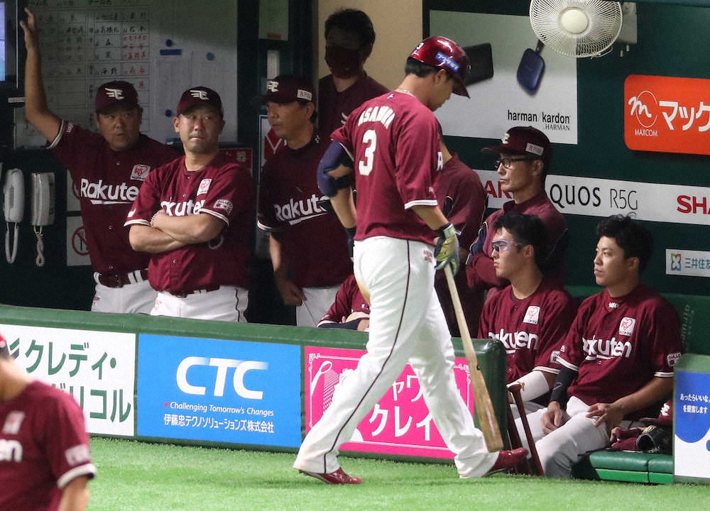 <ソ・楽>6回1死一塁、浅村が三振に倒れガックリの三木監督(左から2人目)ら楽天ベンチ(撮影・岡田 丈靖)