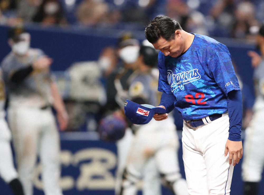 <中・神>阪神に逆転負けを喫し、ガックリと頭を下げる与田監督(撮影・椎名 航)