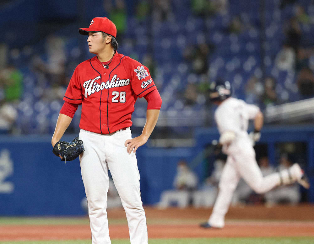 <ヤ・広12>5回1死一塁、山田哲(右)に左越え2ランを打たれた床田(撮影・小海途 良幹)