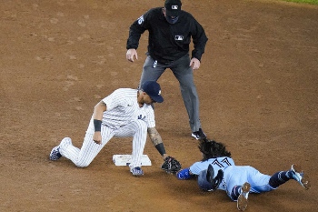▽「ザ・フリップ」 01年10月13日、アスレチックス―ヤンキースの地区シリーズ第3戦でヤ軍が1―0のリードで迎えた7回の守備。2死一塁からの右翼線二塁打で一塁走者Je・ジアンビが長駆生還を狙ったが、一塁ベンチ寄りにそれた右翼手の送球を遊撃手のジーターがバックアップ。巧みなバックトスで本塁で刺した。2連敗で王手をかけられていたヤ軍は勢いづき、ワールドシリーズまで勝ち進んだ。