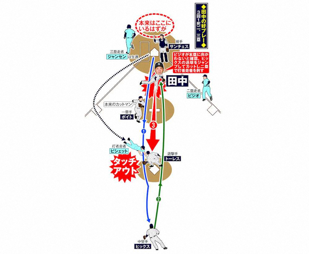 2―1の3回1死二、三塁。ビシェットのピッチャー返しが中前へ抜けた。中堅手の本塁送球がやや高く、ビシェットは二塁をうかがう。だが、なぜか田中が投本間の真ん中にいた。送球をジャンピングキャッチして二塁へ転送。ヘッドスライディングもむなしく憤死したビシェットは、苦笑いで天を仰いだ。