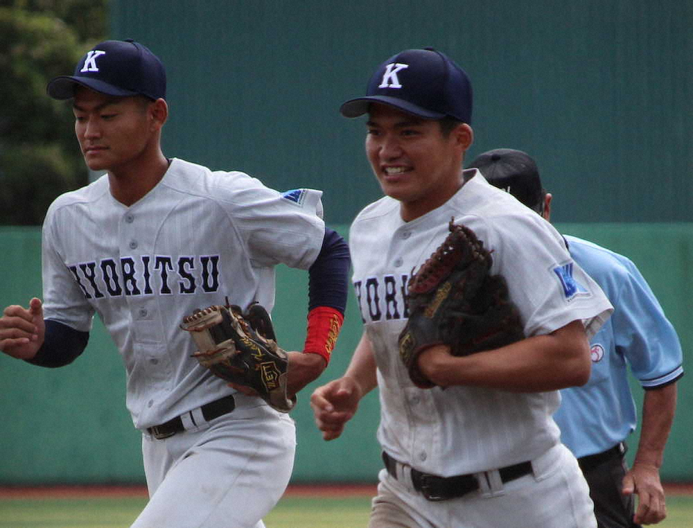 2試合連発の九共大・平良(右)は守備でも活躍、1点差を守り切って笑顔でゲームセット