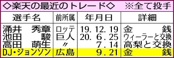 楽天の最近のトレード Photo by スポニチ 楽天 金銭トレードで広島のD・J・ジョンソン獲得 CS進出へブルペン陣強化 ギャラリーで見る この記事のフォト 2020年09月22日の画像一覧 もっと見る 2020年09月22日の画像をもっと見る