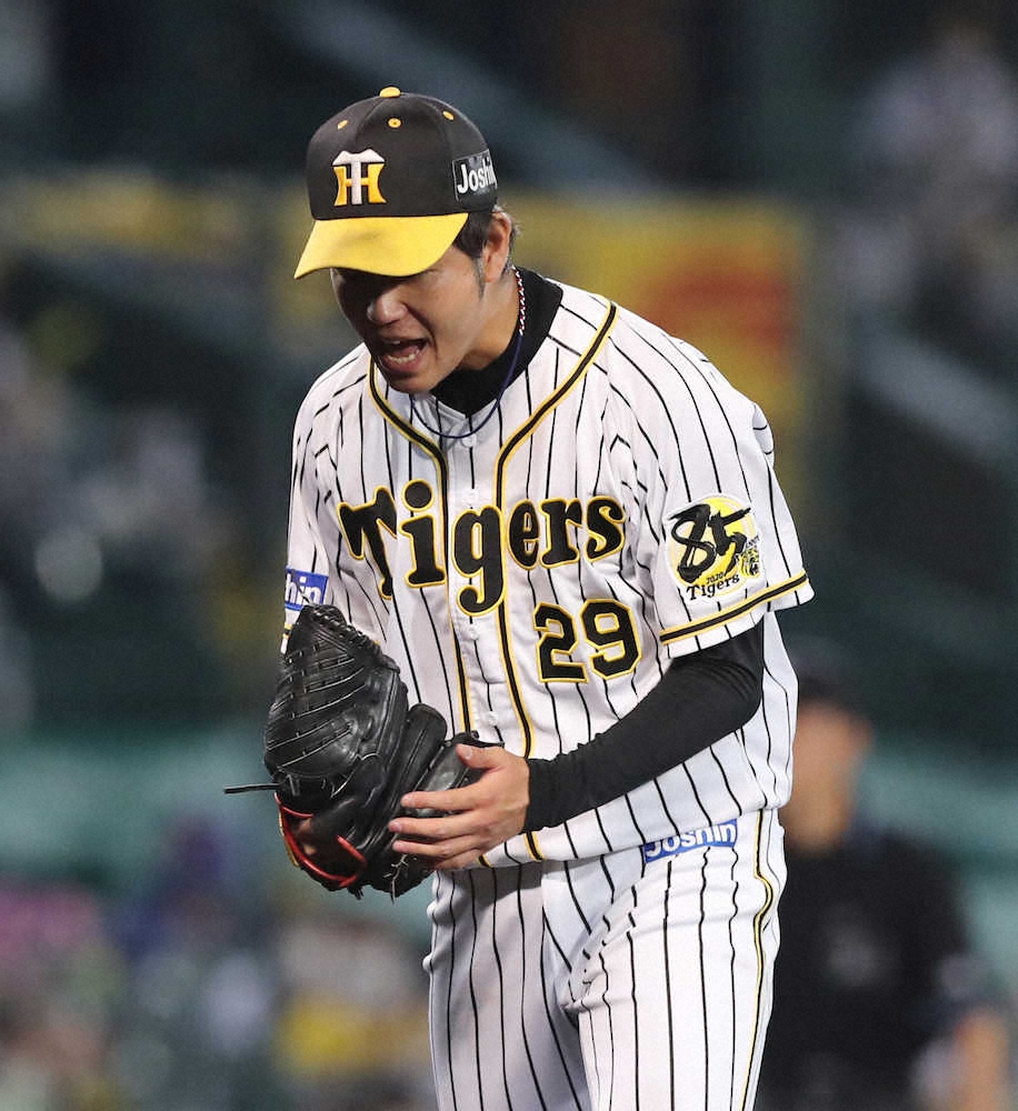 <神・中(16)> 6回2死一塁、京田から三振を奪い、雄たけびをあげる高橋(撮影・大森 寛明)