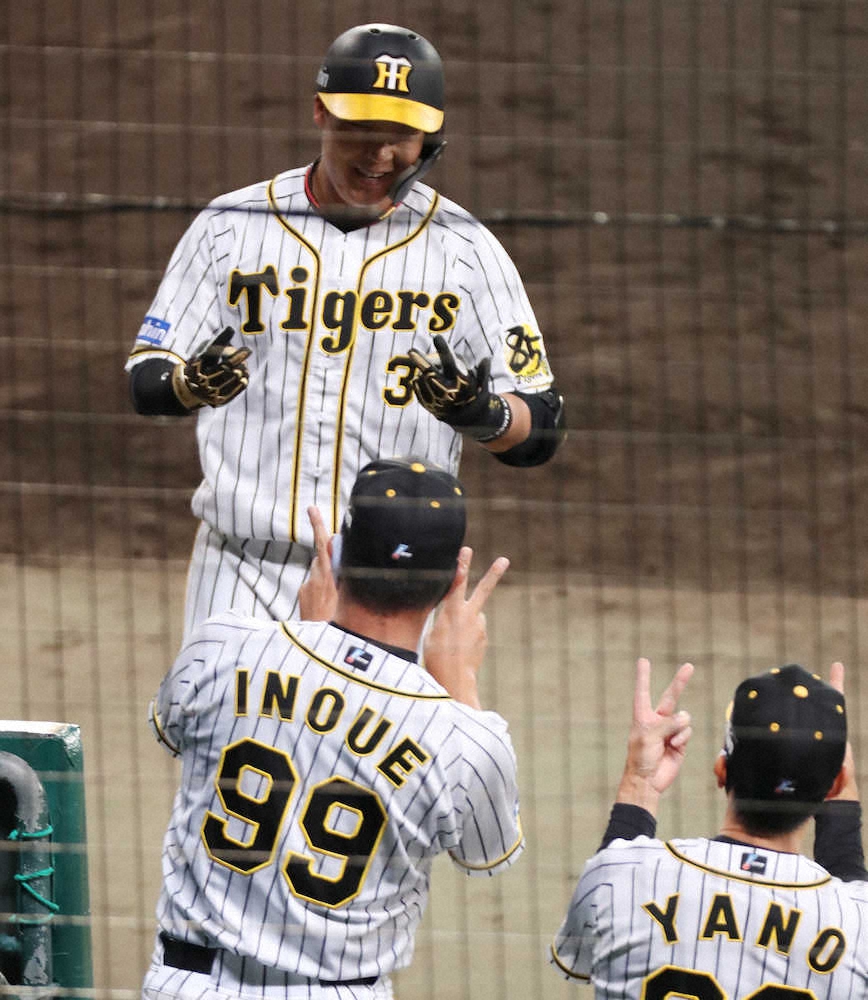 <神・中(16)>6回無死、中越えにソロ本塁打を放ち、“22号ポーズ”?で迎えられる大山(撮影・坂田 高浩)
