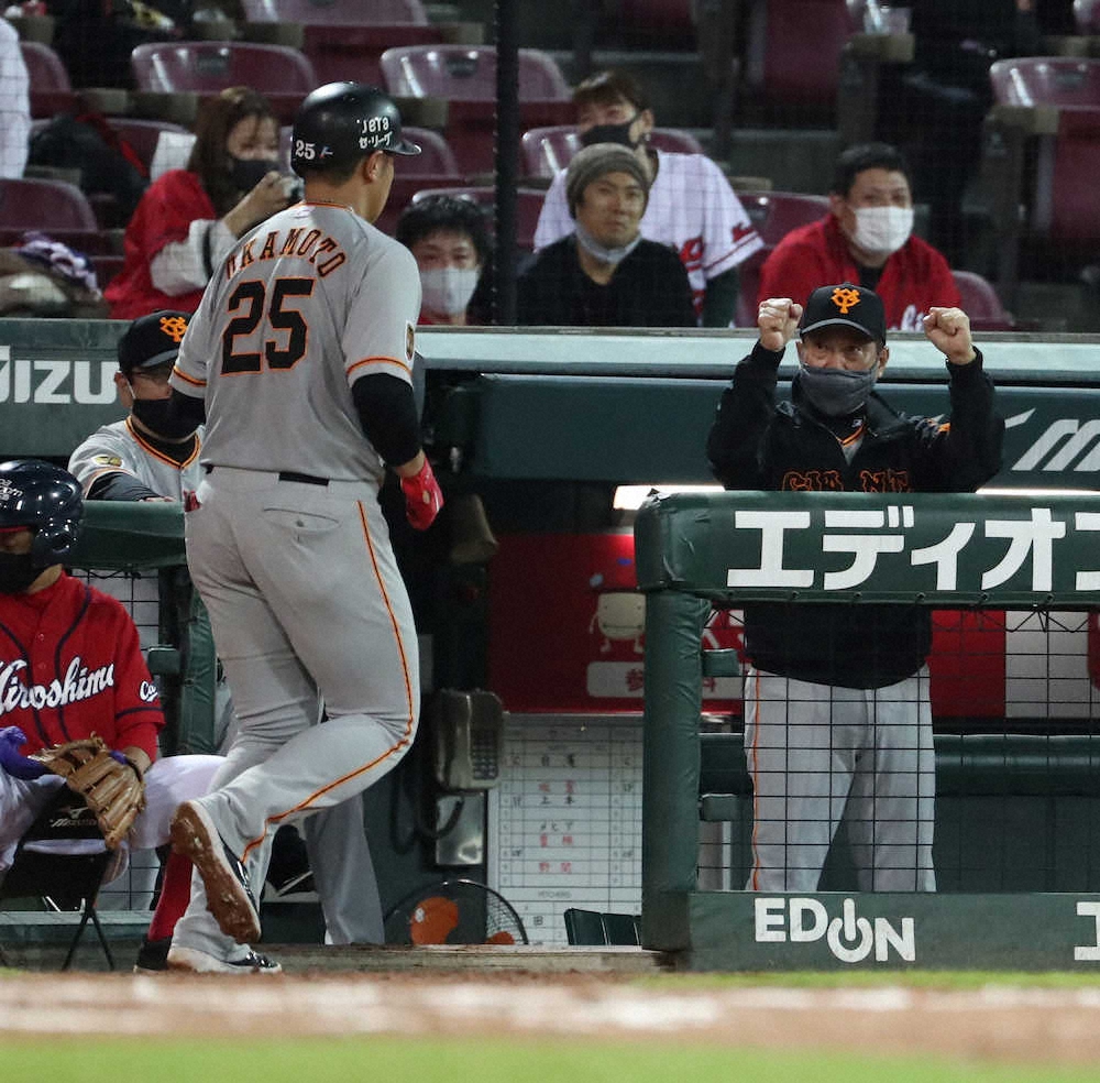<広・巨>8回2死、左中間にソロ本塁打を放った岡本を迎える原監督(右)(撮影・奥 調)