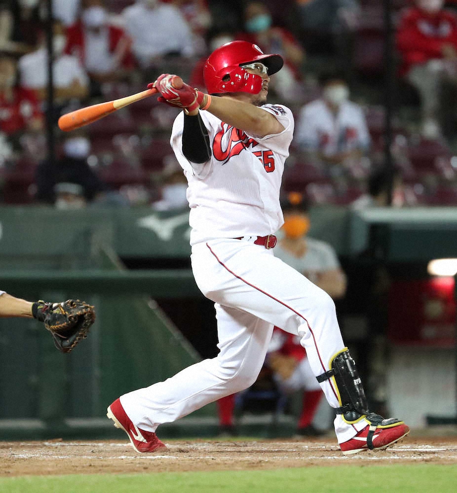 松山は4試合連続で「4番・一塁」として先発出場。来日初先発となった元守護神・スコットが4回で4点を失い、0―4で迎えた4回だった。1死一塁から巨人先発右腕・サンチェスが1ボール2ストライクから投じた4球目、内角高め直球を右中間スタンドへ叩き込んだ。4番から3番に打順を移した前打者の鈴木誠が1死一塁から2打席連続の併殺打かと思われた二ゴロを放ったが、一塁ベースへ全力疾走して併殺を免れ、直後に出た松山の一発。鈴木誠の全力疾走が生きた。