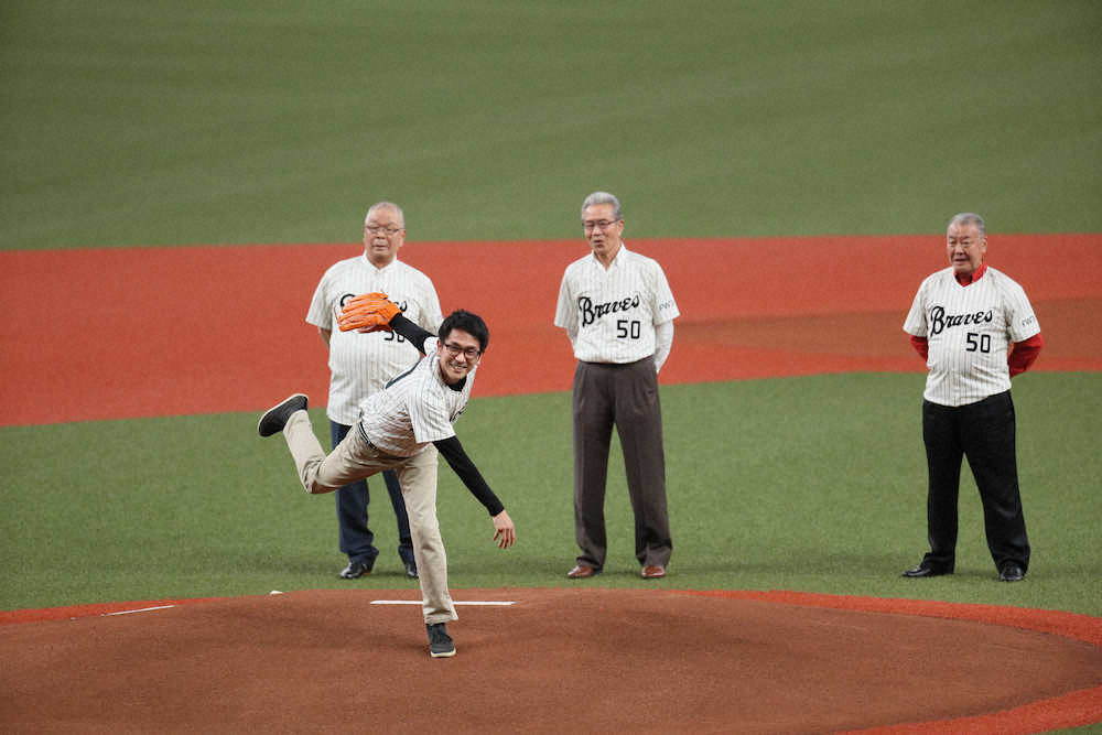 試合前には、西本氏の孫にあたる大家正弘さん(38)が始球式で登板した。マウンド後方の山田久志氏、福本豊氏、加藤秀司氏の阪急OBである3人に見守られる中、ワンバウンド投球を披露。本格的な野球経験はないが、幼少時に西本氏とキャッチボールしたことを笑顔で振り返り「よく“ヘタクソ!”と怒られました」と感慨深げ。「祖父は私から見ても偉大な人物。記念すべき日に、この場に立てるのは光栄です」と名将の凄さを改めて感じていた。