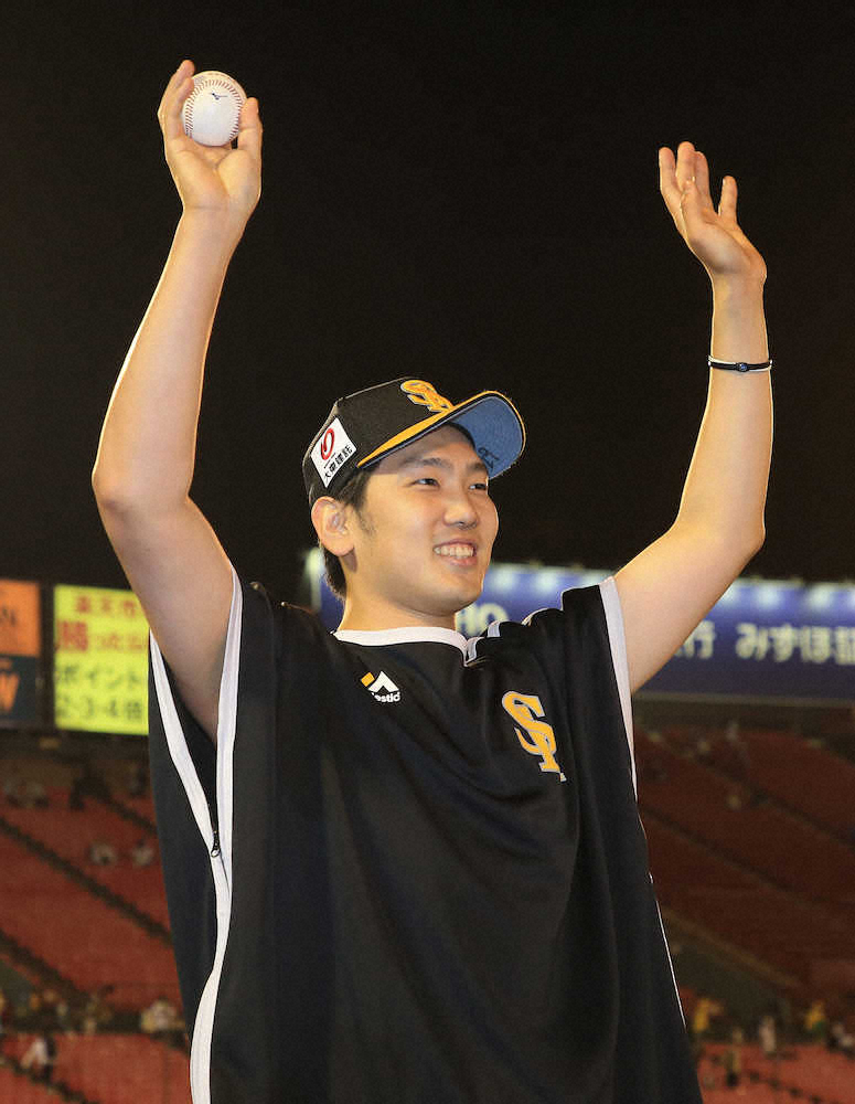 <楽・ソ>楽天に勝利し、スタンドの声援に応える石川(撮影・吉田 剛)