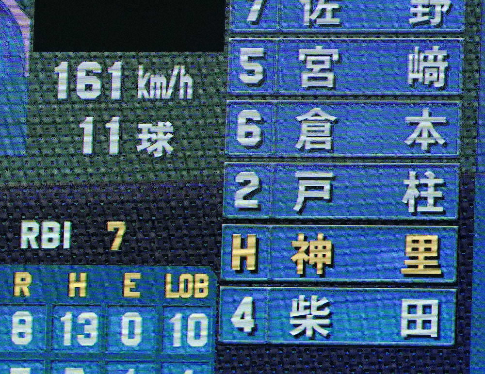 3点リードの9回1死から神里への6球目、内寄りに直球で見逃し三振に仕留めると、球場の電光掲示板は「161キロ」を表示。