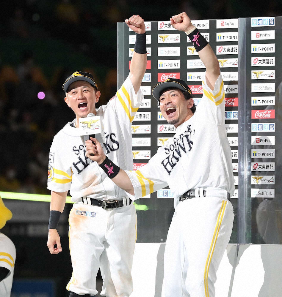 初回、いきなり見せ場がやってきた。2死二塁で回ってきた好機には「やめてくれ」と思いながらも「打ってやるぞ」と気合が入った。先制となる左前適時打には「手応えはあった。三遊間のど真ん中に打ったのが見えたので二塁ランナーが俊足だったので帰ってくるなと思った。周東ありがとう」と激走の走者に感謝した。
