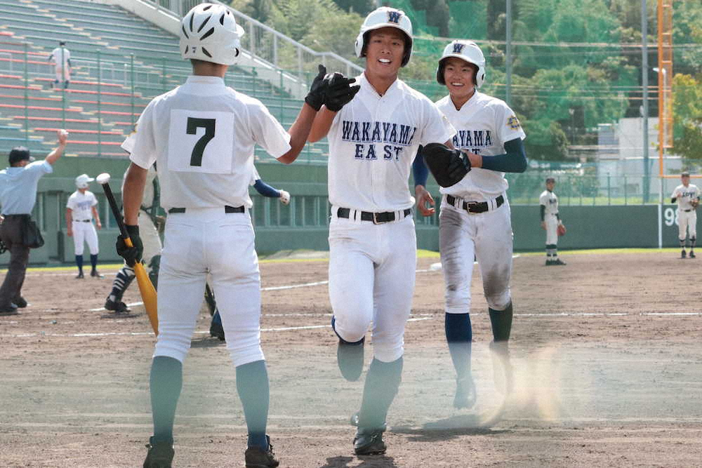 5回1死二塁、左越えに2ランを放ち、笑顔で生還する和歌山東4番・上代
