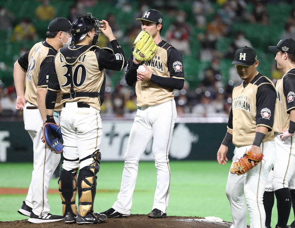 <ソ・日>3回のピンチにマウンド上に集まる上原(中)ら日本ハムナイン(撮影・岡田 丈靖)
