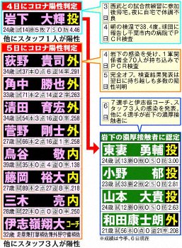 7選手には荻野、角中、清田、藤岡ら主力の名前が並んだ。4日に陽性となった岩下と飛行機などで隣席だった和田、小野ら4人は濃厚接触者として特定された。松本本部長は陽性者の復帰のメドについて「早ければ1週間」としたが、陰性となるまで戻れない。濃厚接触者は2週間の隔離が必要となる。