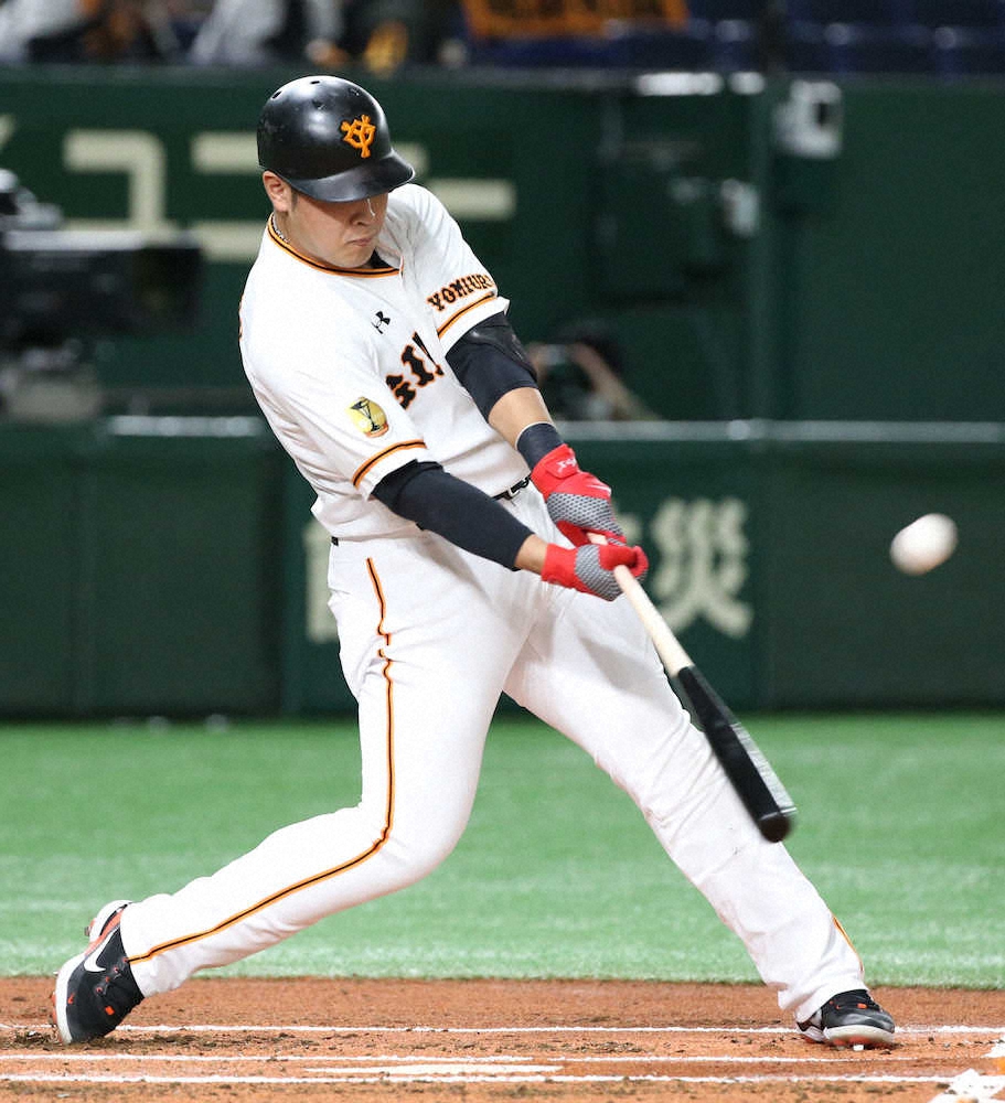 <巨・D>初回2死二塁、先制2ランを放つ岡本(撮影・森沢裕)