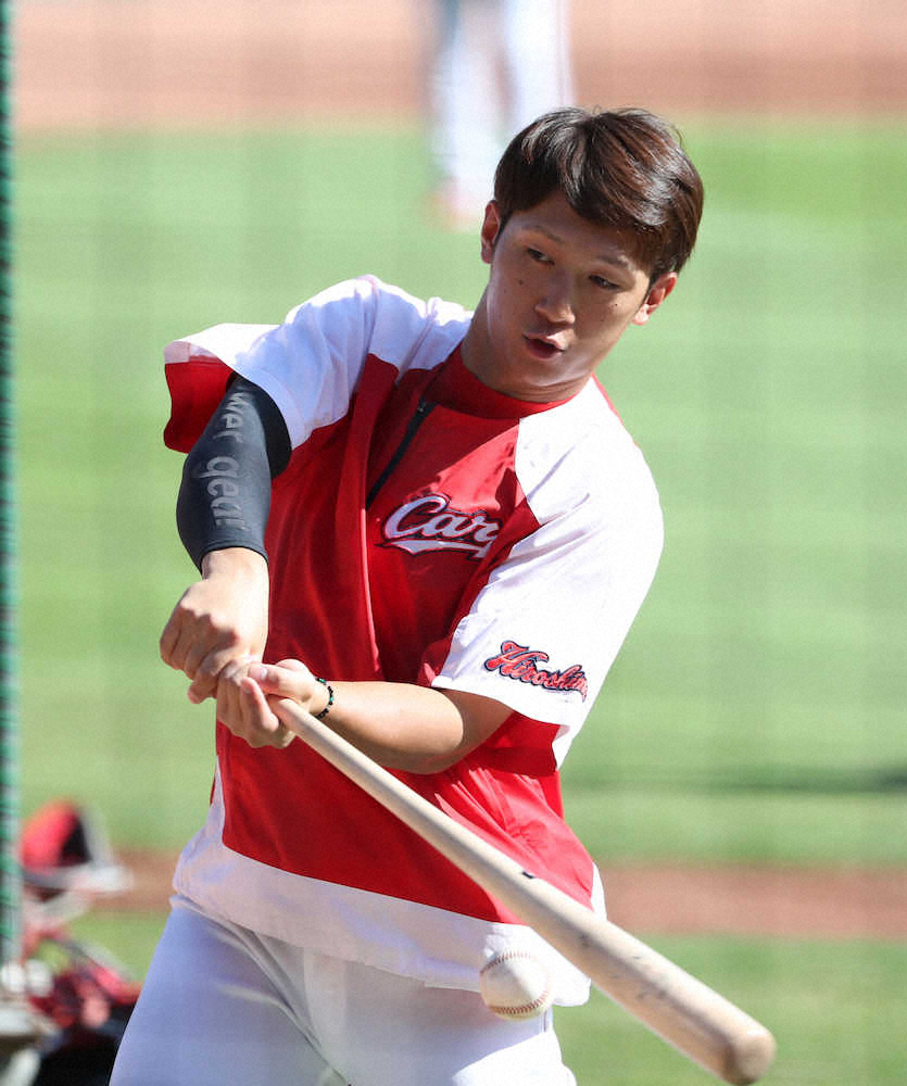 <広・ヤ(20)>1軍に合流しティー打撃に励む広島・西川 (撮影・奥 調)
