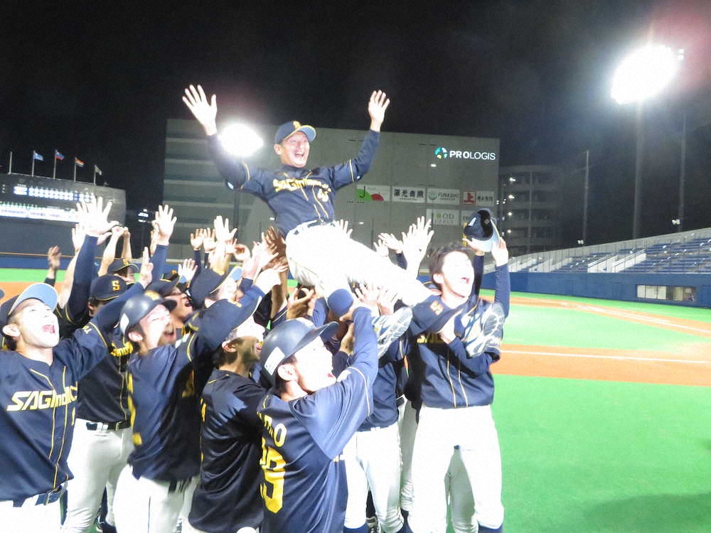 都市対抗・東京代表最終枠を完封勝利で勝ち取り鷺宮製作所ナインに胴上げされる岡崎監督
