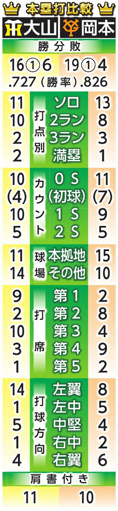 大山(神)と岡本(巨)は、ともに本塁打を放った時の勝率が7割以上。大山が第1打席で9本放ったのに対し、岡本は2本と比較的少ない。球場別では広い甲子園を本拠地とする大山はビジター、比較的狭い東京ドームを主戦場にする岡本はホームが多くなっている。中堅から右方向へは大山が40%(10本)、岡本が48%(12本)を占めており、広角に打てることが量産につながっている。先制、同点、勝ち越し、逆転、サヨナラの肩書付き本塁打は、大山が11本で丸(巨)と並びリーグ最多。岡本も10本で同3位タイと、効果的な一発が多い。