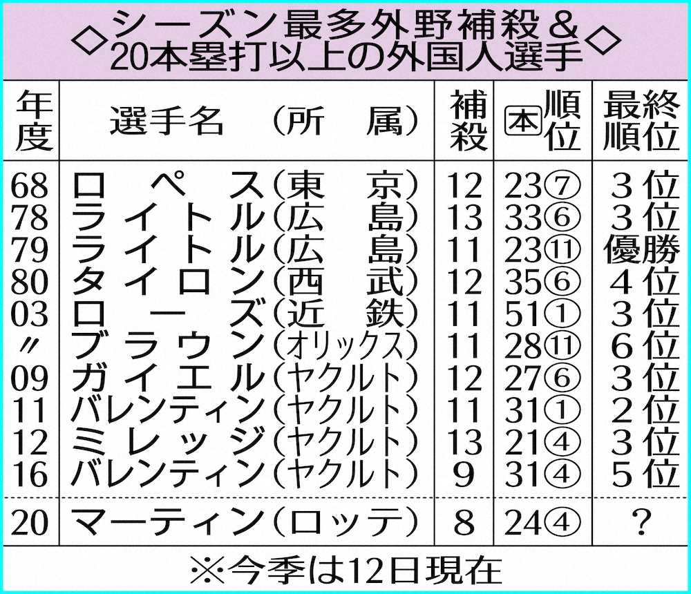 達成間近の記録(12日現在) Photo by スポニチ ロッテ・マーティン 外国人外野手でパ史上初の“優勝&最多補殺&20発”な… ギャラリーで見る この記事のフォト 2020年10月13日の画像一覧 もっと見る 2020年10月13日の画像をもっと見る