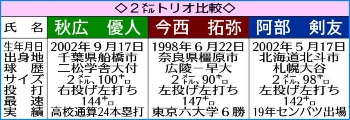 早大の今西は最速147キロを誇る左腕で、変化球も多彩。二松学舎大付の右腕・秋広は投手歴が約1年ながら最速で144キロを投げ、打者としても高校通算24本塁打を放つなど、二刀流として高い身体能力を発揮してきた。札幌大谷の阿部は「他の投手にはない角度で打者を抑えたい」という142キロ左腕。3選手ともに今後の伸びしろに期待がかかる。