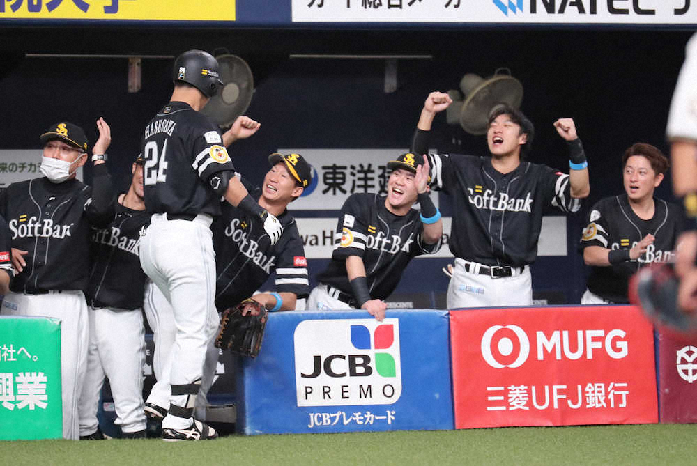 <オ・ソ>6回、代打満塁弾の長谷川をガッツポーズで迎える柳田ら(撮影・井垣 忠夫)