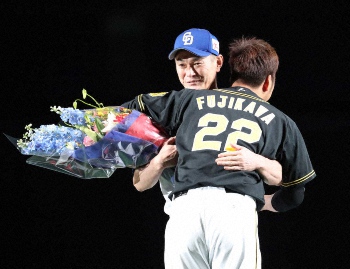 18年、岩瀬の引退セレモニーで藤川(右)は花束を渡し、抱き合う
