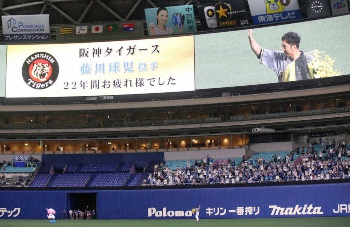 ★伝説の9・7 05年のリーグ優勝への契機となった一戦。審判の判定で紛糾し、岡田監督の「メチャクチャやったれ」の猛ゲキもあって延長戦に勝利。藤川は6回からの2回を4奪三振で1失点。問題の9回には珍しくベンチから怒号を飛ばす姿も。