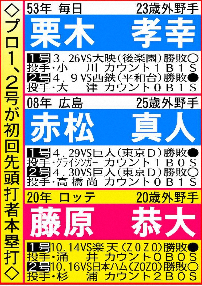 <ロ・日>1回無死、藤原は右中間ソロ(撮影・小海途 良幹) Photo by スポニチ ロッテ・藤原 史上3人目プロ2号も先頭弾!主力4人1軍復帰で緊急昇格組が… ギャラリーで見る この記事のフォト 2020年10月17日の画像一覧 もっと見る 2020年10月17日の画像をもっと見る