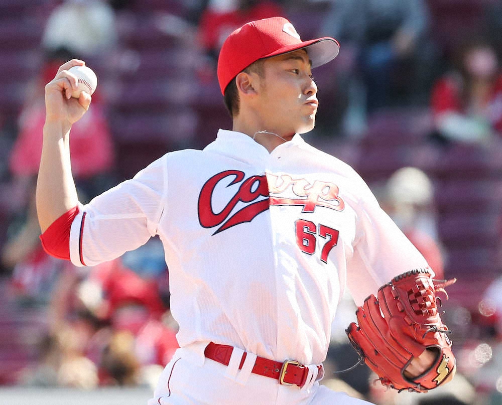 直球の球速は140キロ前後でも、打者は捉えきれなかった。佐々岡監督が「前回登板からスライダーがよく曲がっている。独特のスライダー。打者は打ちづらそう」と評価したように、曲がり球が効果的だった。今季最多の110球。走者を背負い続けても三塁は踏ませなかった。