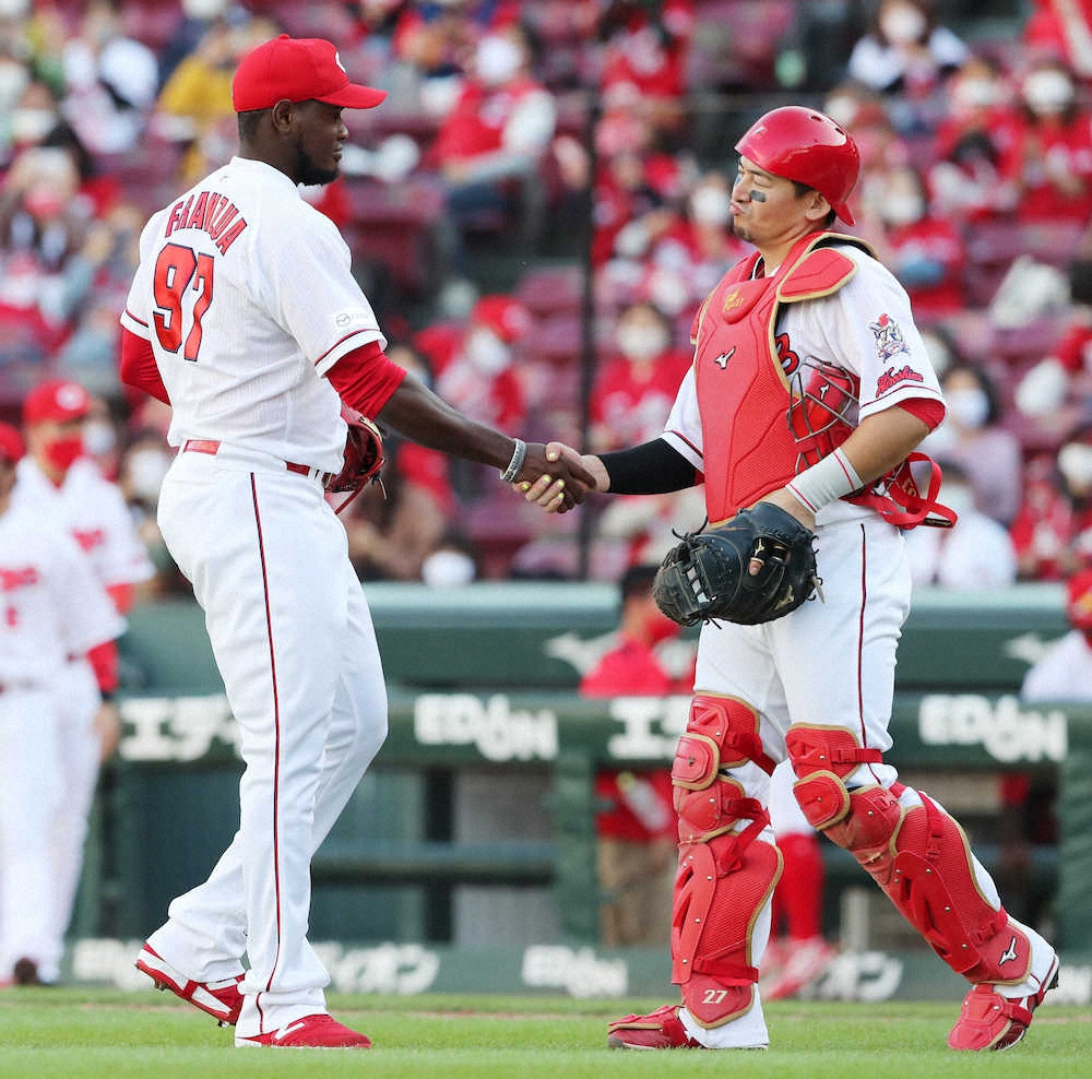 <広・中(20)>最後を締めたフランスアは会沢(右)と握手する(撮影・椎名 航)
