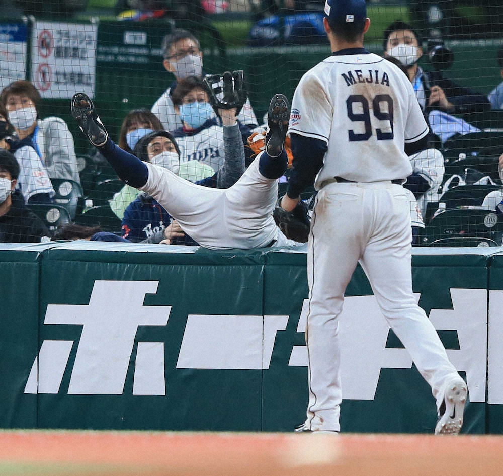 <西・ロ>8回無死一塁、中村奨の邪飛をフィールドビューシートのネットに飛び込みながら捕球した山野辺(右)は、素早くグラウンドに戻り福田のタッチアップを阻止する(撮影・尾崎 有希) Photo by スポニチ 西武・山野辺がスーパー美技で3タテ演出 辻監督「ラッキーボーイ!」 ギャラリーで見る この記事のフォト 2020年10月22日の画像一覧 もっと見る 2020年10月22日の画像をもっと見る