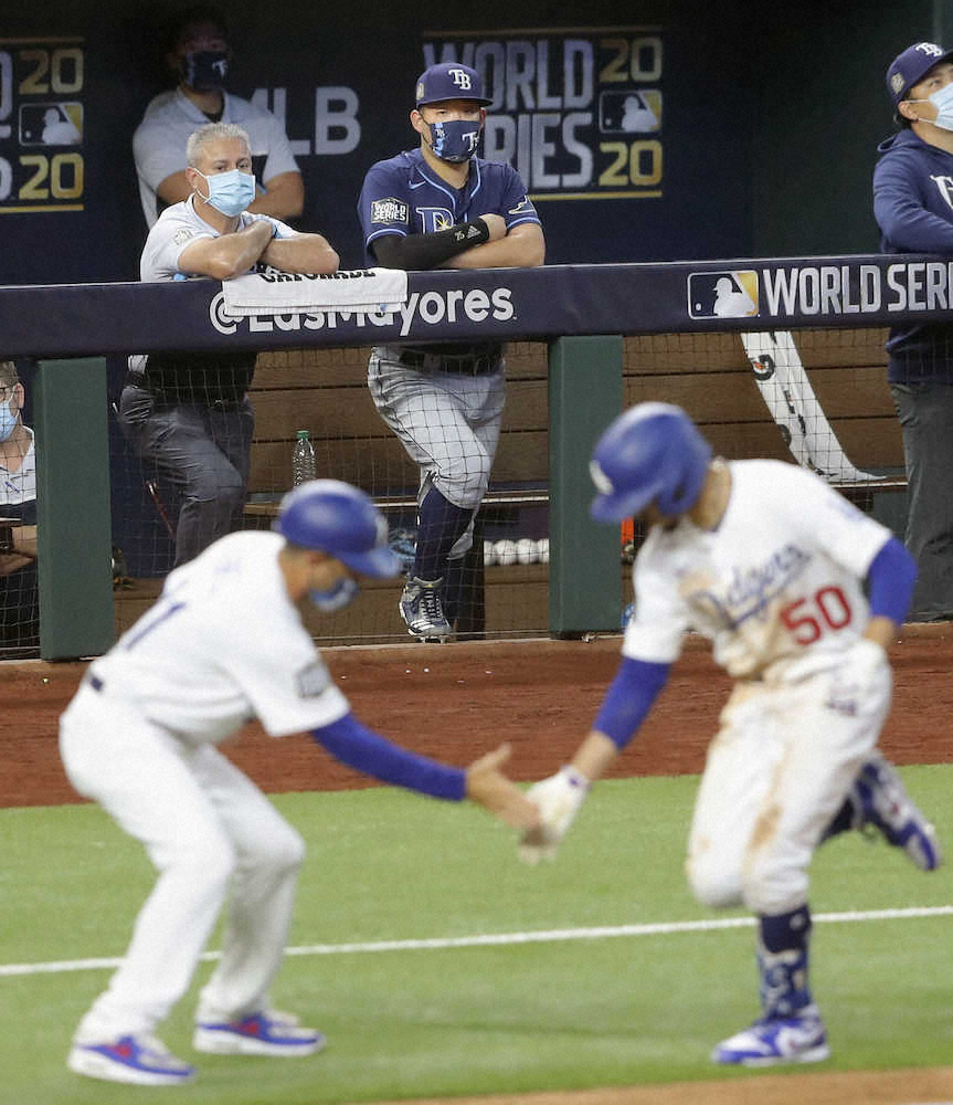 6回、本塁打を放ちコーチとタッチするベッツ(手前右)をベンチから見つめるレイズ・筒香