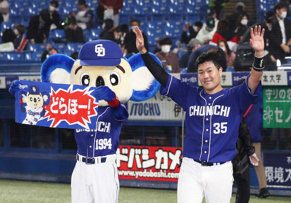 <ヤ・中21>ヒーローインタビューに答えた木下拓(右)はドアラとともにポーズをとる(撮影・西海健太郎)
