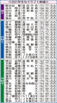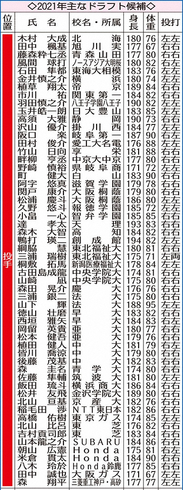 21年主なドラフト候補・野手編 Photo by スポニチ 来年ドラフト候補は? 大阪桐蔭・関戸、高知・森木…150キロ超の剛腕目白押… ギャラリーで見る この記事のフォト 2020年10月27日の画像一覧 もっと見る 2020年10月27日の画像をもっと見る
