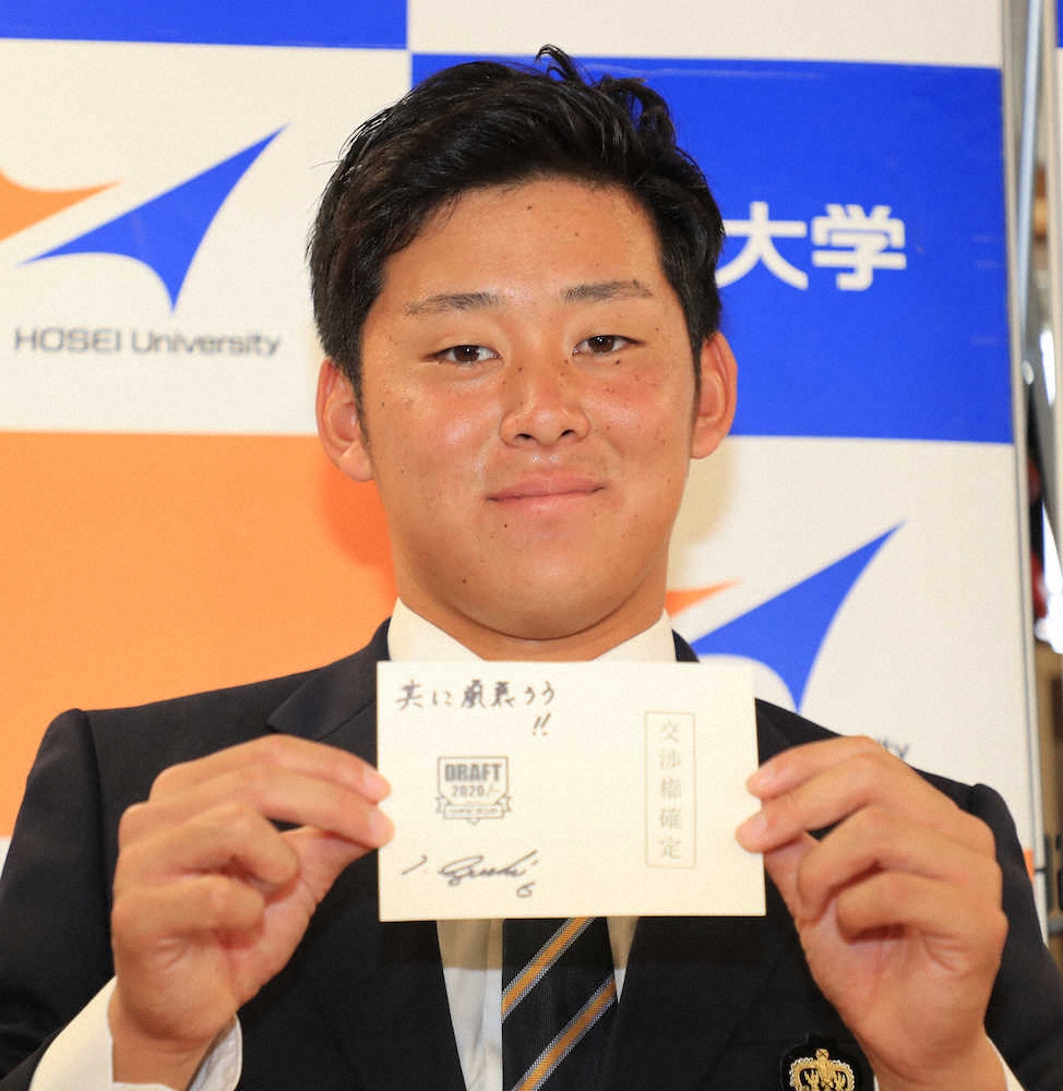 <ロッテ1位法大・鈴木指名あいさつ>井口監督のサインボールを手に笑顔の法大・鈴木(撮影・篠原 岳夫) Photo by スポニチ ロッテ1位法大・鈴木「実感が徐々に」「昭汰と呼んで」“12球団一番乗り”指… ギャラリーで見る この記事のフォト 2020年10月27日の画像一覧 もっと見る 2020年10月27日の画像をもっと見る