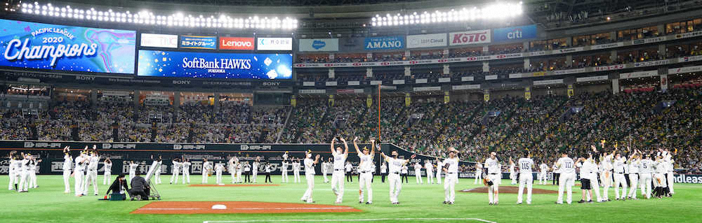 <ソ・ロ>リーグ優勝を決めバンザイして喜ぶ工藤監督(左端)らソフトバンクナイン(撮影・岡田 丈靖) Photo by スポニチ ソフトバンク“新様式”で歓喜 胴上げなし、大きな輪になってファンと万歳… ギャラリーで見る この記事のフォト 2020年10月27日の画像一覧 もっと見る 2020年10月27日の画像をもっと見る