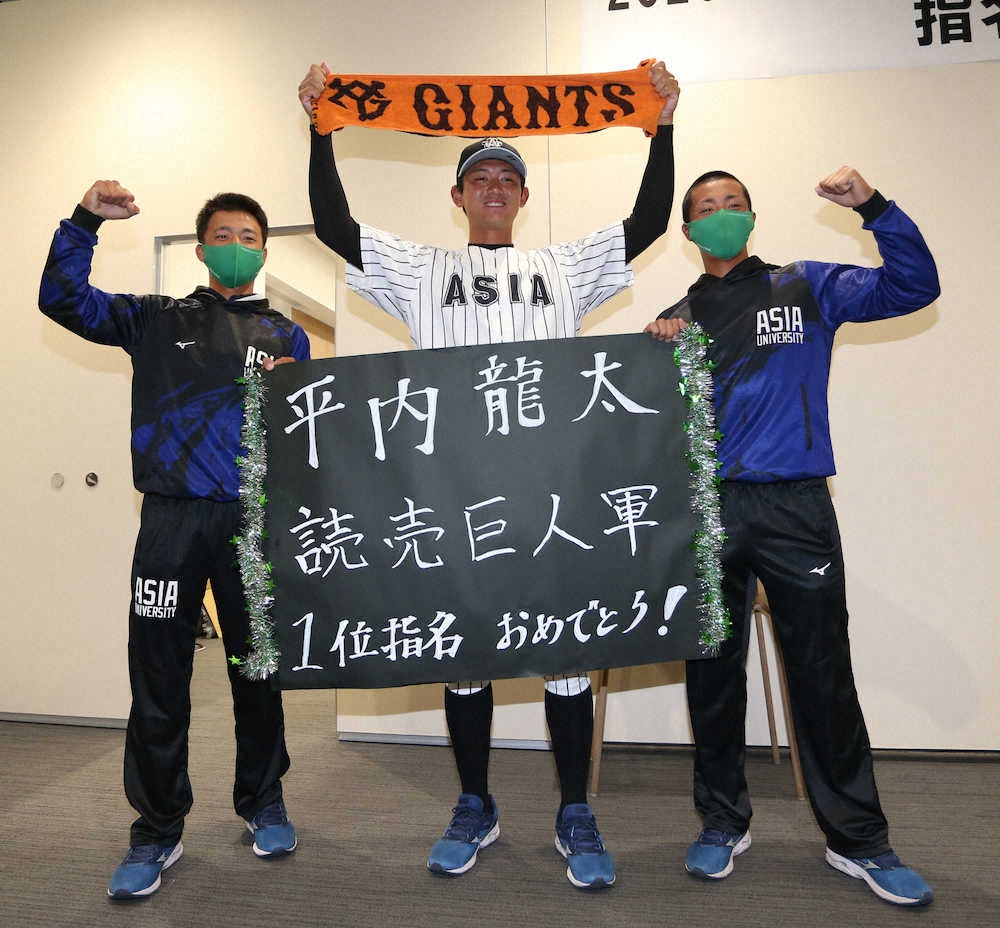 亜大・平内は、プロ志望届を提出した高校3年時は指名がなかった男が、巨人から1位指名を受けた。3人指名の亜大勢で一番に名前を呼ばれた平内は「(巨人は)伝統ある球団。そういうチームで自分も活躍したい」と目を輝かせた。